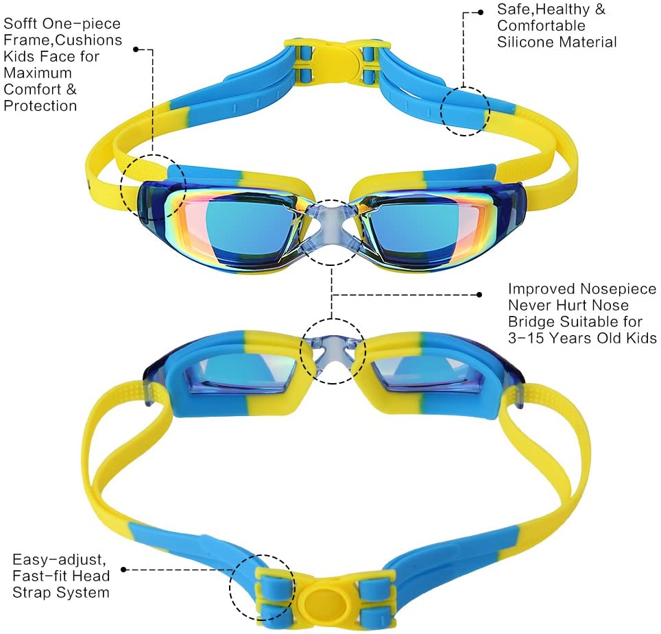 Otter Kids Swim Goggles, Swim Goggles for Kids Children Swimming Goggles with Anti-Fog UV Protection No Leaking Coated Lens with Case for Boys Girls Youth Kids