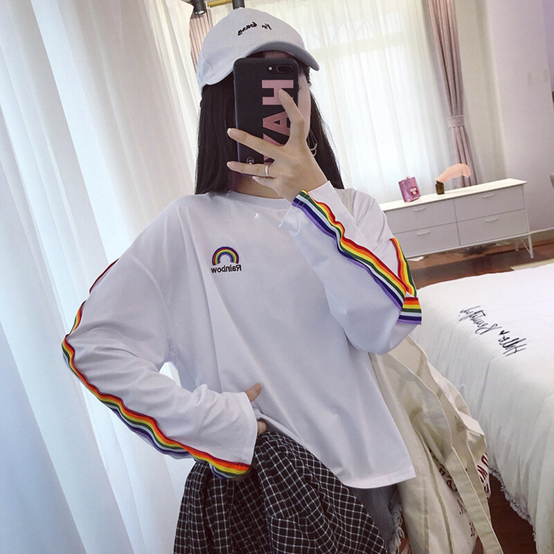 Vanessawang Women Loose Rainbow Shirt Letter Embroidery Long Sleeve Blouse Casual Stripe Top