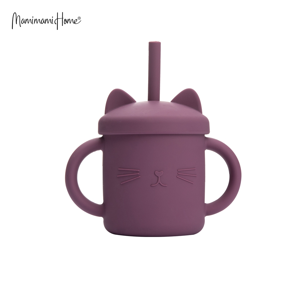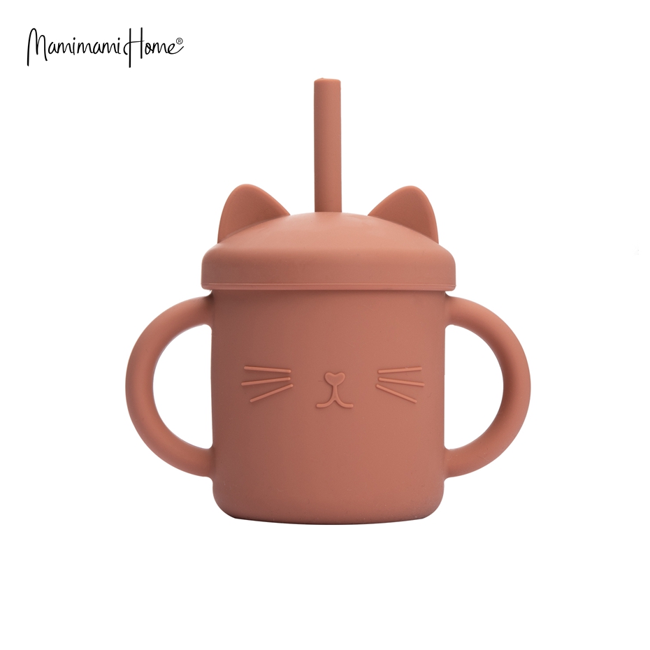 Mamimami Home Kids Sippy Cup 1PC 100% Food Grade Silicone Cups with Straw & Cover Cartoon Cat Baby Self-feeding Essentials