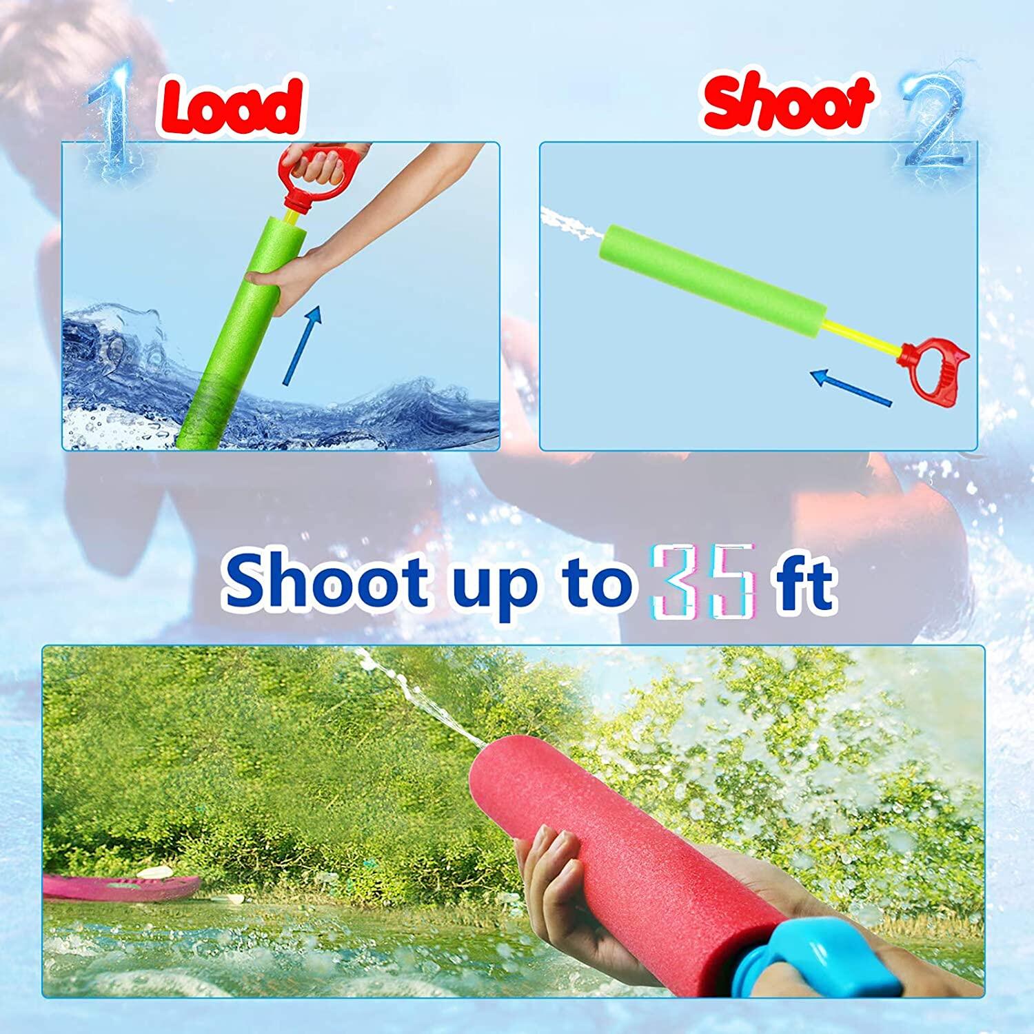 Just put the Foam Water Toy' s head into the water, pull the handle, the water toy barrel will suck in water, when shooting, push the handle to spray the water. It' s easy to use!