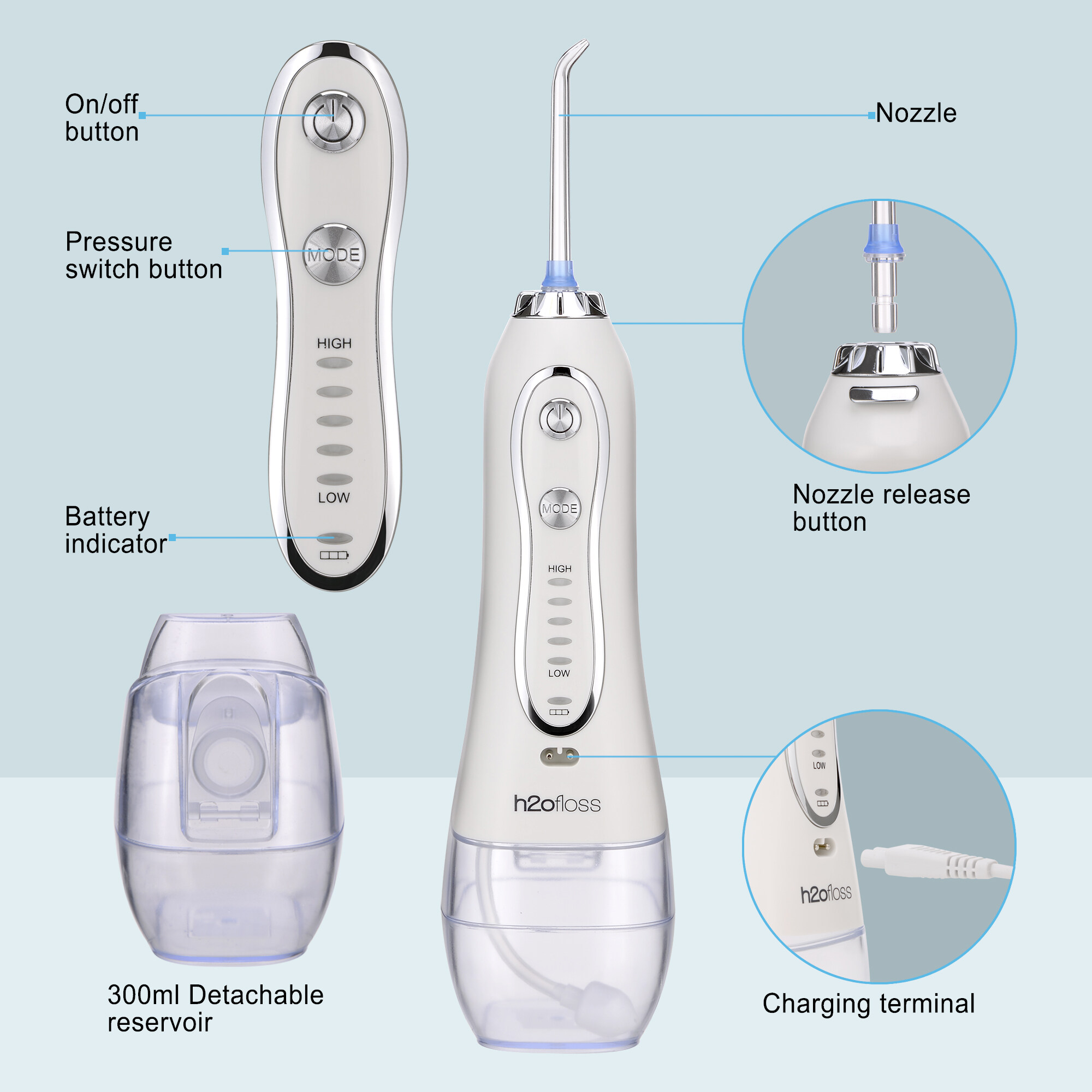 H2ofloss Portable Oral Dental Irrigator Cordless Wate Flosser Waterproof Teeth Cleaner with 5 Modes 5 Jets Tips and 300ml Detachable Reservoir Rechargeable Dental Flosser for Brace Bridges Care, Home Travel
