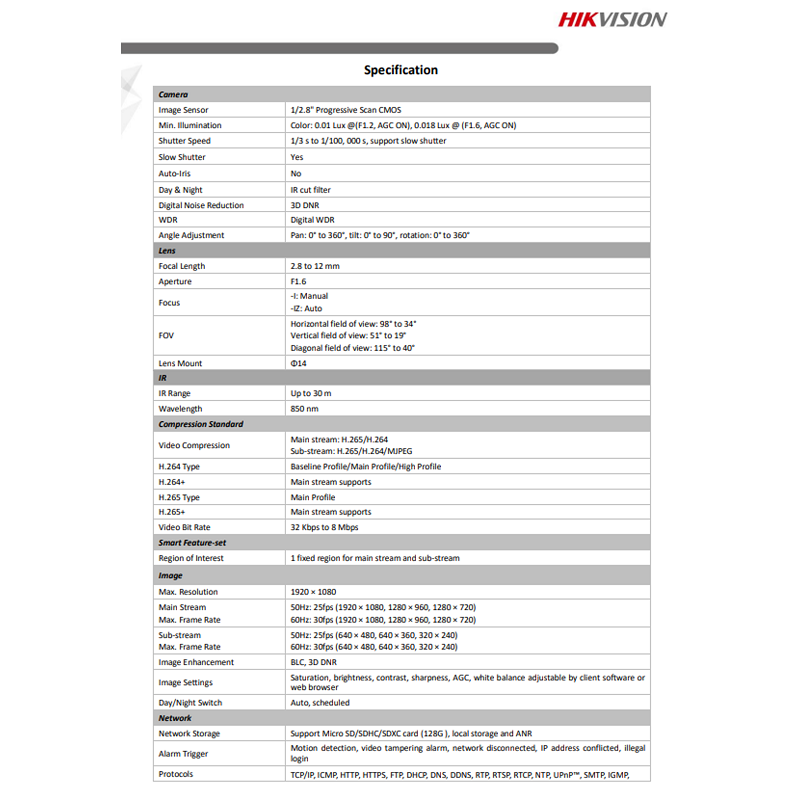 Hikvision DS-2CD1623G0-IZ 2MP EXIR Varifocal Bullet CCTV Network IP Camera
