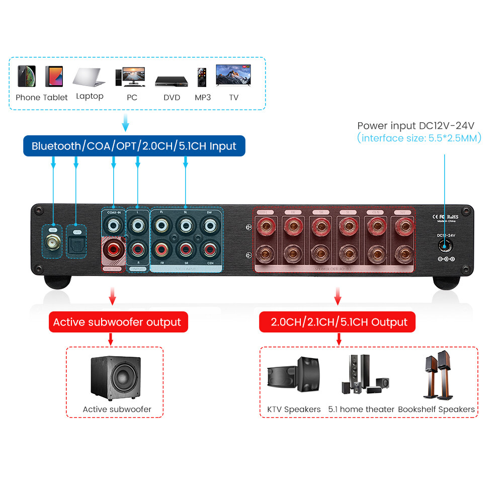 5.1 channel amp with professtional DSP decoding: A9 with built-in DSP decoding chip which applies professional algorithms and dynamic separation techniques, it auto allocates and simulates 2.1 and 5.1 channel and provide excellent smart noise reduction, precise sound positioning and stereo surrounded sense even though playing audio files of 2.0 channel.