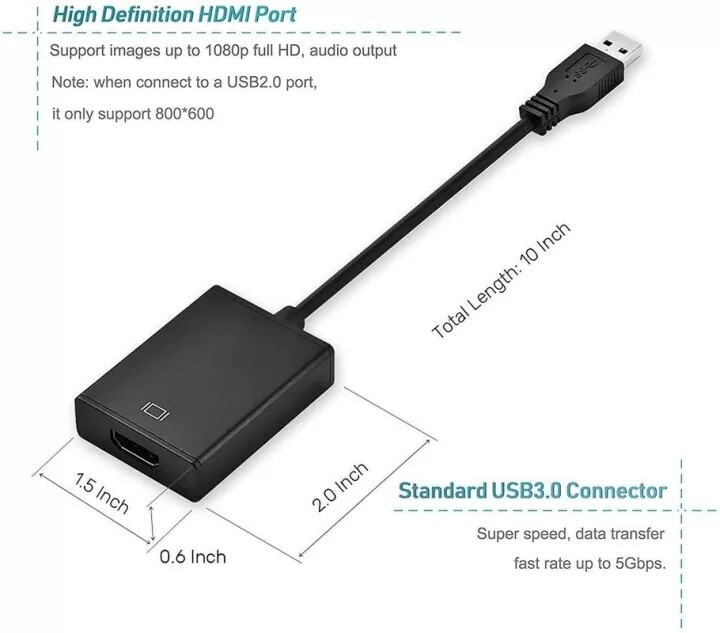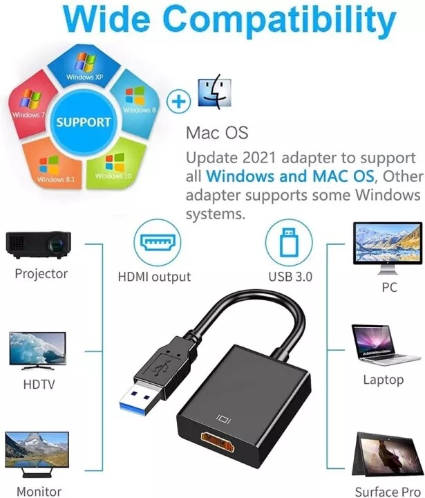 • 【USB to VGA adapter】will be connected to a PC or laptop with a USB 3.0 / 2.0 port to connect to a high -definition TV, projector or display with a VGA port to get the second screen. VGA cables are sold separately. This adapter is compatible with Windows XP, Windows 7, Windows 8 / 8.1, Windows 10.