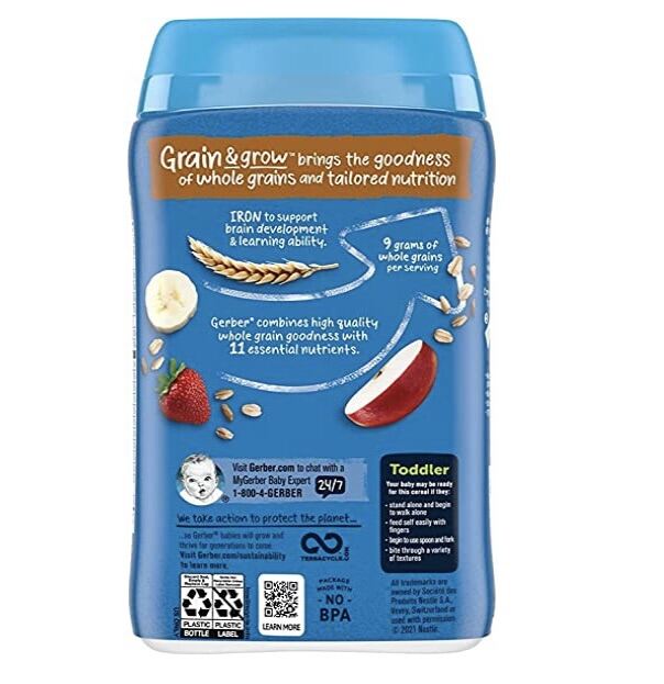 Whole wheat flour, whole oat flour, sugar, rice flour, banana flakes, oat flour, strawberry flavored bits (cornstarch, strawberry puree, strawberry juice concentrate), dried apples, whole grain rye flour, pearled barley flour, potassium phosphate, natural apple flavor, red beet juice powder (color).Vitamins And Minerals: Calcium carbonate, magnesium oxide, vitamin C (ascorbic acid), iron (electrolytic), zinc sulfate, niacinamide, vitamin E (alpha tocopheryl acetate), vitamin B1 (thiamine mononitrate), vitamin B2 (riboflavin), vitamin A palmitate, vitamin B6 (pyridoxine hydrochloride), folic acid, vitamin D3, vitamin B12.