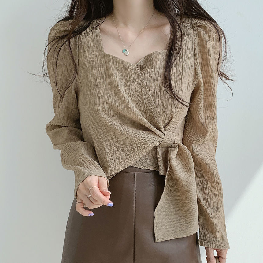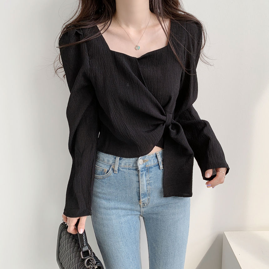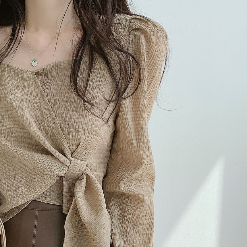 EDQRDQ Women's Casual Puff Sleeve Long Sleeve Square Neck Bow Self Tie Slim Fit Crop Tee Tops