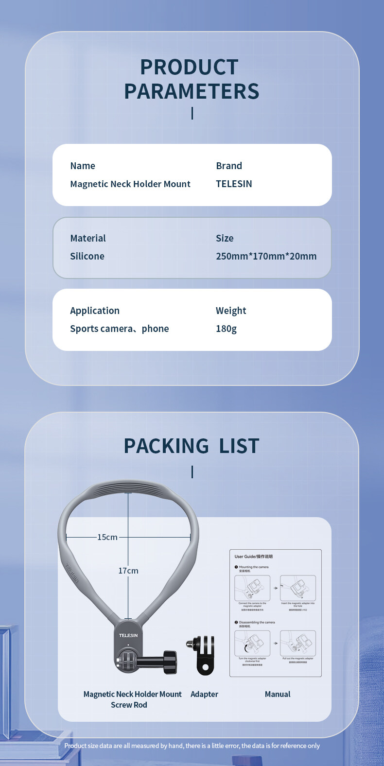 1.Name:Magnetic neck holder mount 2.Brand:TELESIN 3.Material:Silicone 4.Size:250mm*170mm*20mm 5.Fit for action camera and smartphone 6.Weight:180g