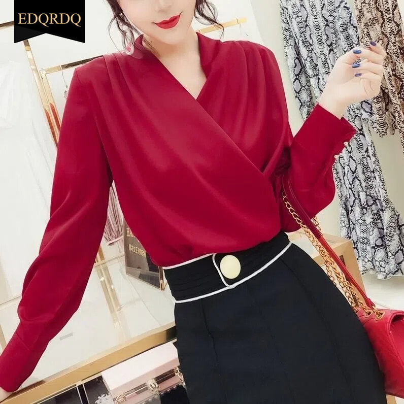 EDQRDQ Women's Casual Chiffon Tops V Neck Long Sleeve Elegant Shirts Wrap Blouses