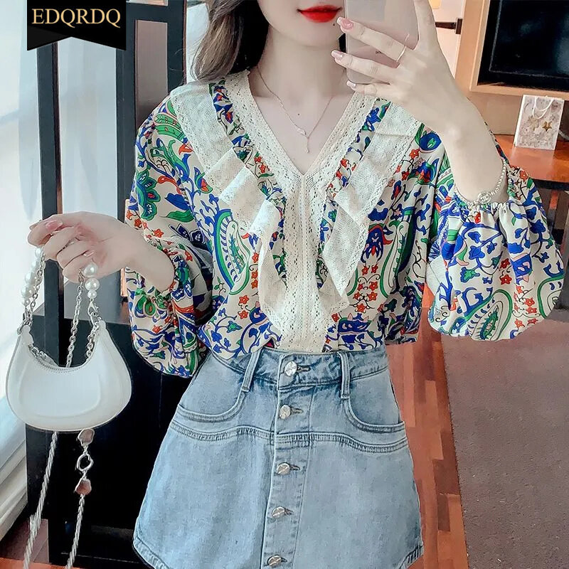 EDQRDQ French Floral Tops Puff Sleeve Lace Shirts Ethnic Blouses for Women