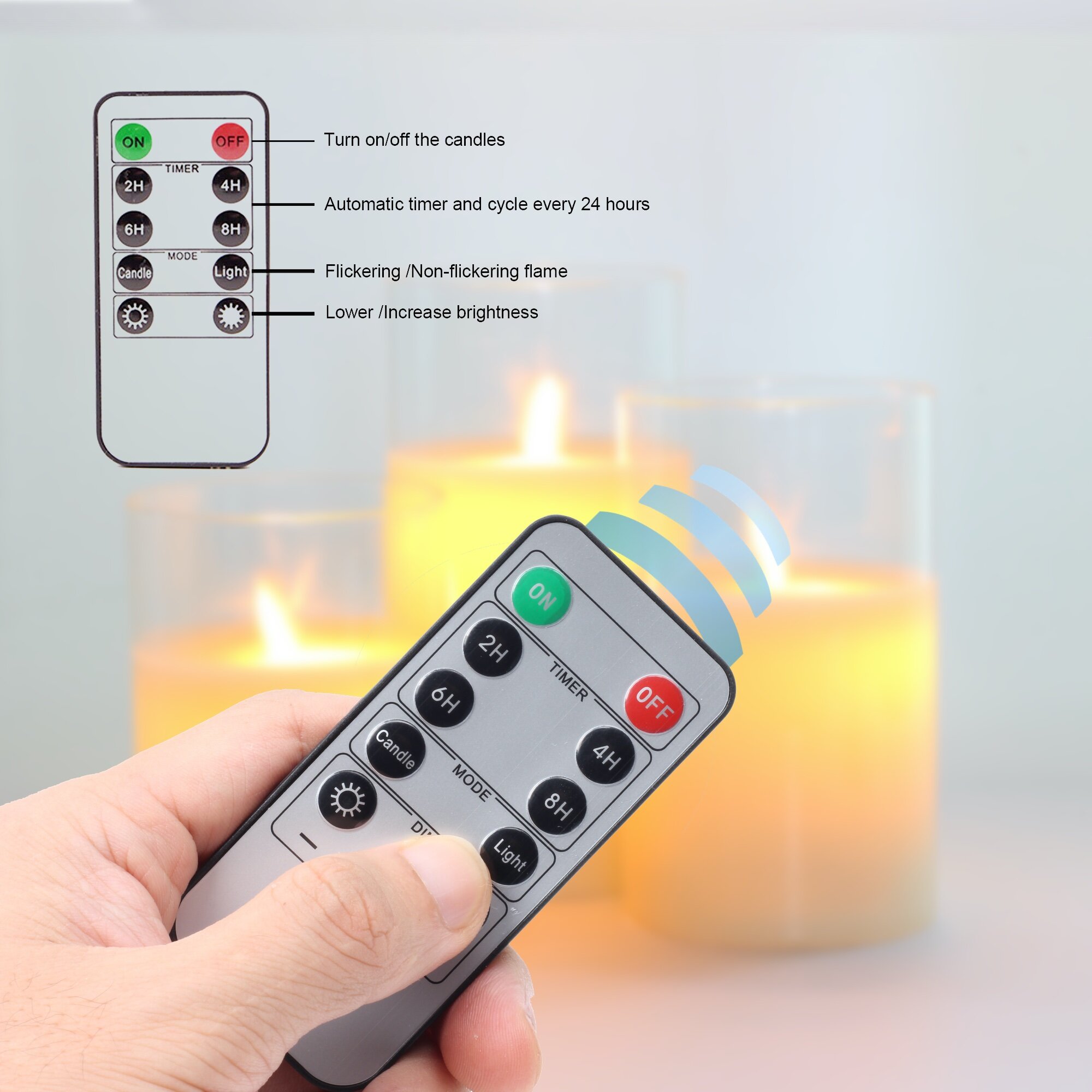With 10-key remote control, you can adjust the brightness dimmer or brighter. Flickering flame effect and steady light mode available. Timer feature allows you to set 2H 4H 6H 8H, timed to automatically on and off, cycle every 24 hours.