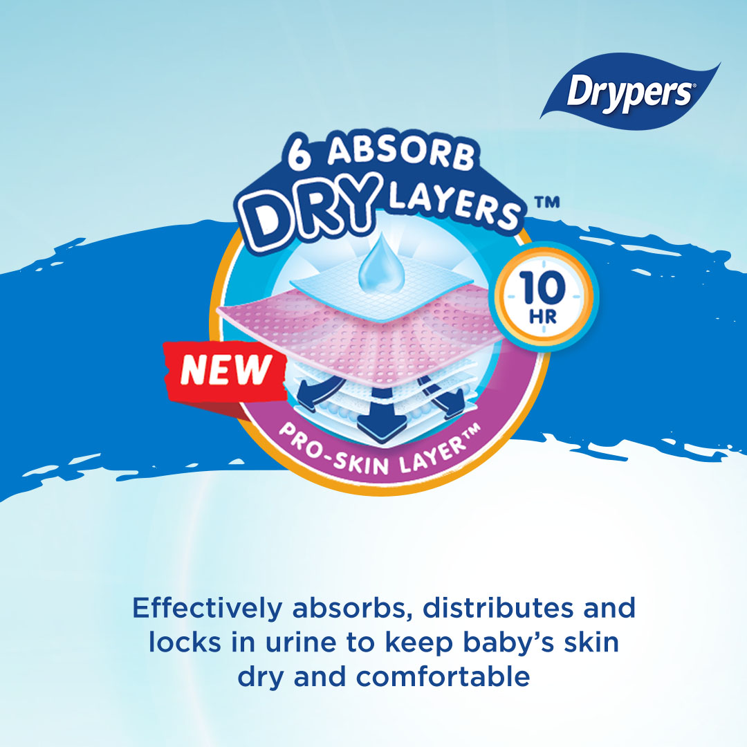 Our NEW Drypers Drypantz with improved DRY & FIT coupled with NEW PRO-SKIN™ pH balanced layer which protects baby from skin irritation. What’s more? It is ECO-GREEN, our commitment to caring for baby & nature.Drypers Drypantz is now with 6 AbsorbDryLayers™ effectively absorbs, distributes, and locks in urine to keep baby’s skin dry and comfortable for up to 10 hours dryness. Each of the layer are enhanced with the NEW PRO-SKIN™ pH Balanced Layer helps to balanced off the urine of baby so to protect baby from skin irritation. Made with 100% Breathable Self-Cool Cover™ that allows air circulation to keep baby’s skin cool and dry. Naturally releasing heat and moisture through micro-pores, even during hot weather. It also come with tailored FIT for babies at different growth stages. CrawlFIT™ for M sized specially designed for babies who are learning to crawl, provides a perfect cuddle fit around baby’s waist & leg for active movement & leakage protection. MoveFIT™ for L-XXL sized provide great fit & leakage protection as baby grows & discovers the world around him/her. NEW Drypers Drypantz is now come with wetness indicator to remind parents to change when it turns from yellow to green! Making diapering worry free; and to focus on child’s development.As our commitment to caring for baby & nature, it is ECO-GREEN! Manufactured without chemicals that are harmful to the environment (MIT/CMIT, BPA, PVC, Dioxin, Heavy Metal, Phthalate and Organotin), eco-friendly ink and USDA certified, both our diaper bag & box can be recycled with the relevant recycle system.