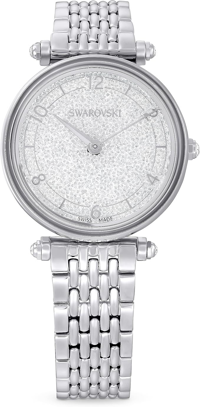 • Exquisite style: Featuring a white silver-tone dial embellished with Arabic numerals and approximately 1,000 crystals, this watch allows for maximum sparkle in the way that only Swarovski crystals can